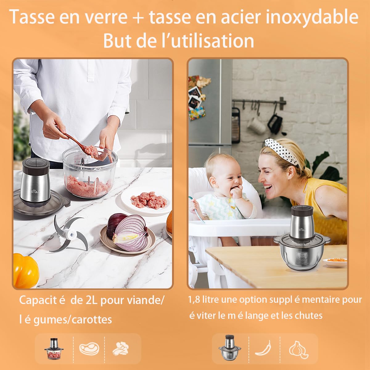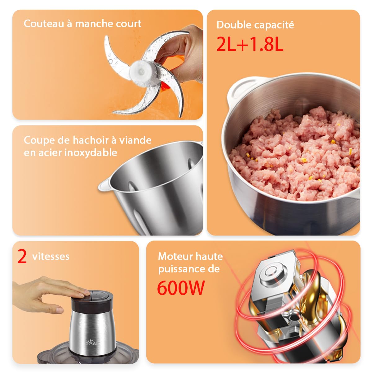 Bear 2L+1.8L Hachoir Électrique En Acier Inox, 600w 2 Vitesses, 4 Lames En Acier Inoxydable