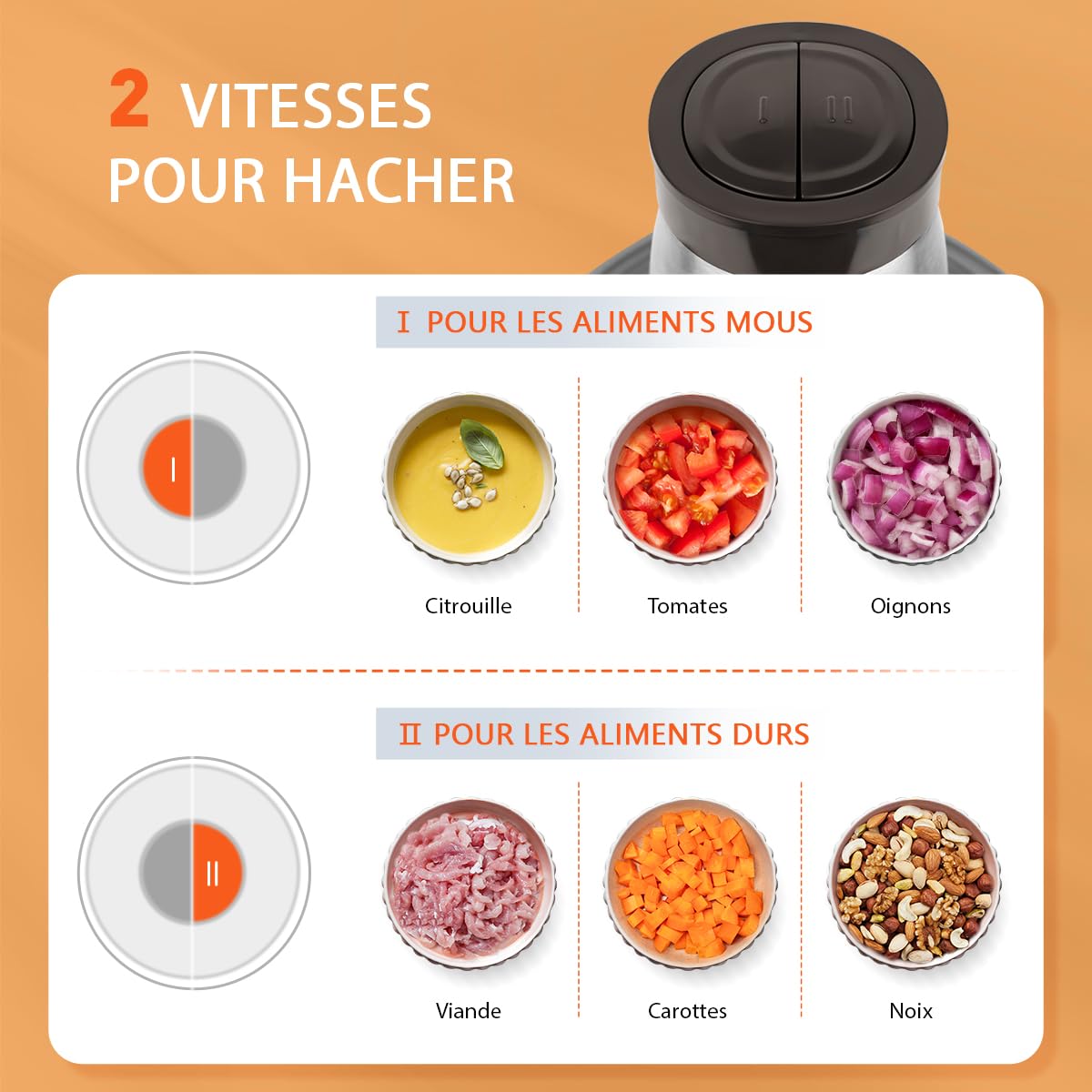 - 💪[2-Speed] Puissance du hachoir à viande 600W, peut facilement hacher, couper et mélanger une variété d'aliments en peu de temps, la vitesse 1 est adaptée aux aliments faciles à hacher tels que les légumes, les fruits, l'ail, les piments, les oignons ou les soupes froides. La vitesse 2 convient aux aliments durs tels que la viande, les noix, les carottes, le jambon ou le fromage.
