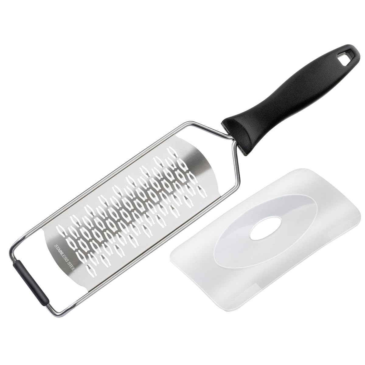 La lame de la râpe est fabriquée en acier inoxydable, la protection de la lame est en plastique transparent et le manche est en plastique pour assurer une bonne prise en main.